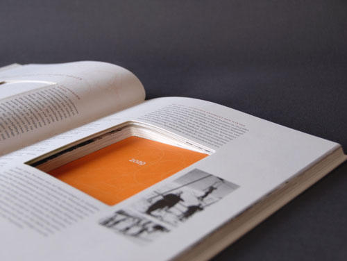 Stanzung im Buchblock als Fach für eine kleine Broschüre.
